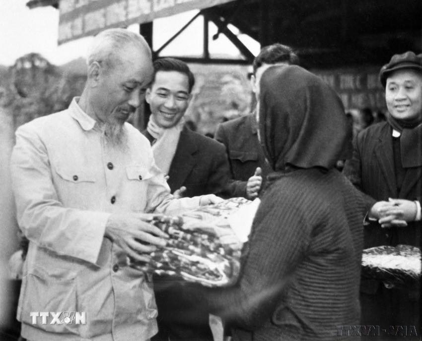Đồng bào các dân tộc Pác Bó tặng Chủ tịch Hồ Chí Minh hoa và vải thổ cẩm, loại vải đẹp do đồng bào dệt (20/2/1961). (Ảnh: TTXVN)