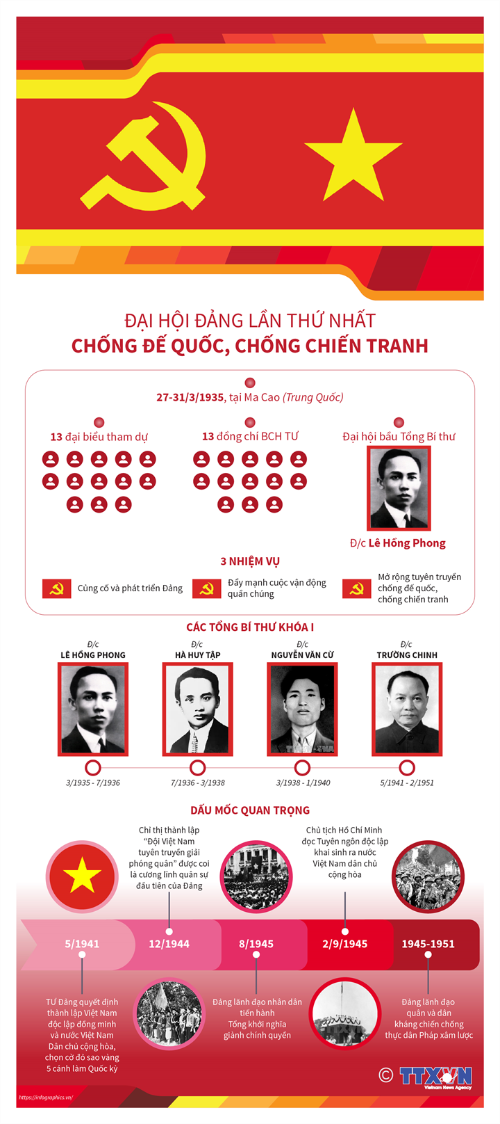 Đại hội Đại biểu lần thứ I của Đảng diễn ra từ ngày 28 đến 31/3/1935, tại một địa điểm ở phố Quan Công, Ma Cao (Trung Quốc). Đồng chí Lê Hồng Phong được bầu làm Tổng Bí thư (tháng 7/1936, đồng chí Hà Huy Tập được cử làm Tổng Bí thư, đến tháng 3/1938, đồng chí Nguyễn Văn Cừ được cử làm Tổng Bí thư và đến tháng 5/1941, đồng chí Trường Chinh được bầu làm Tổng Bí thư).