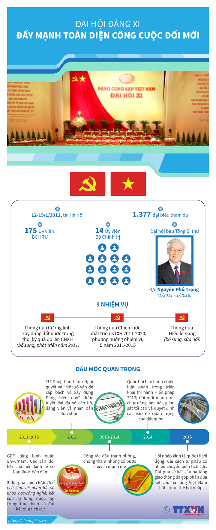 Đại hội Đại biểu lần thứ XI của Đảng diễn ra từ ngày 12 đến 19/1/2011 tại Trung tâm Hội nghị quốc gia, thủ đô Hà Nội. Đồng chí Nguyễn Phú Trọng được bầu giữ chức Tổng Bí thư.