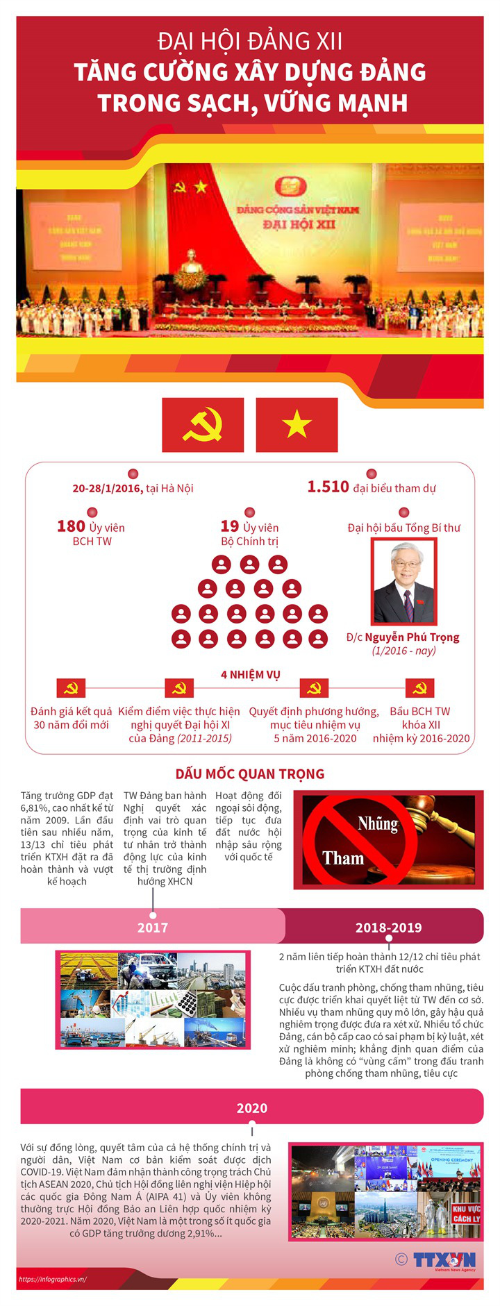 Đại hội Đại biểu lần thứ XII của Đảng diễn ra từ ngày 20 đến 28/1/2016 tại Trung tâm Hội nghị quốc gia, thủ đô Hà Nội. Đồng chí Nguyễn Phú Trọng được bầu lại giữ chức Tổng Bí thư.