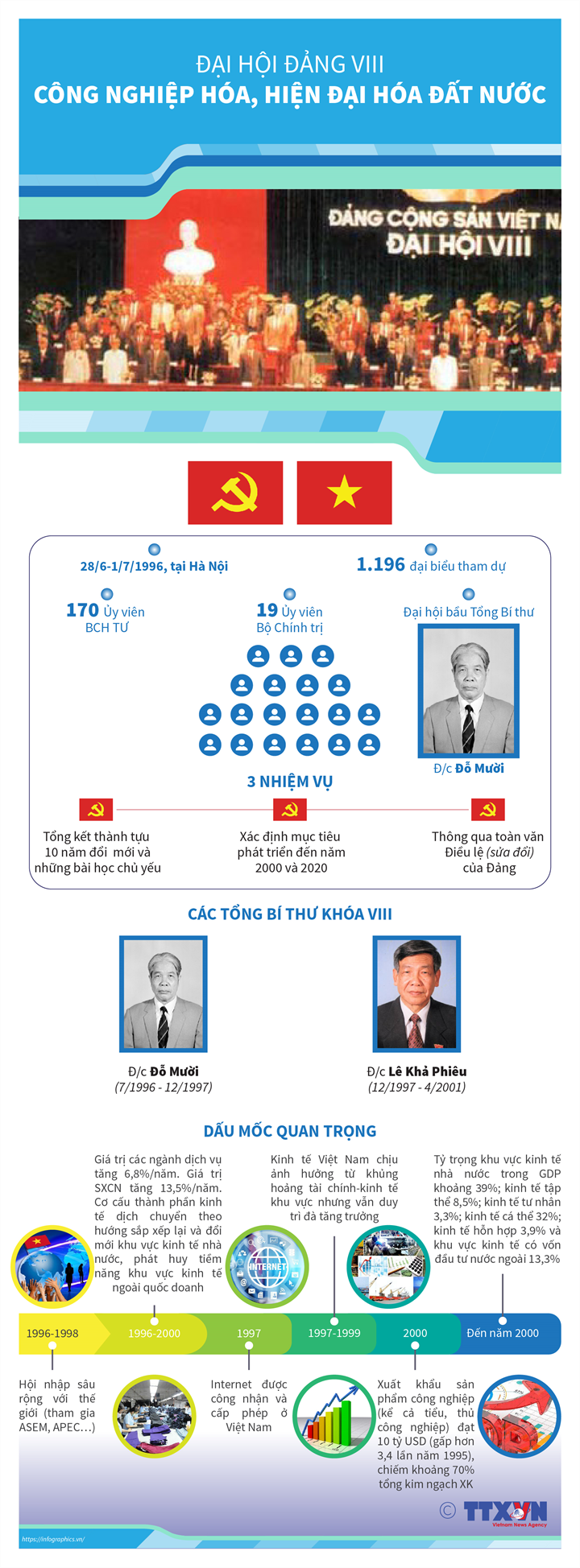 Đại hội Đại biểu lần thứ VIII của Đảng diễn ra từ ngày 28/6 đến 1/7/1996 tại thủ đô Hà Nội. Đồng chí Đỗ Mười được bầu làm Tổng Bí thư (tại Hội nghị lần thứ 4 Ban Chấp hành Trung ương Đảng khóa VIII ngày 26/12/1997 bầu đồng chí Lê Khả Phiêu giữ chức vụ Tổng Bí thư).
